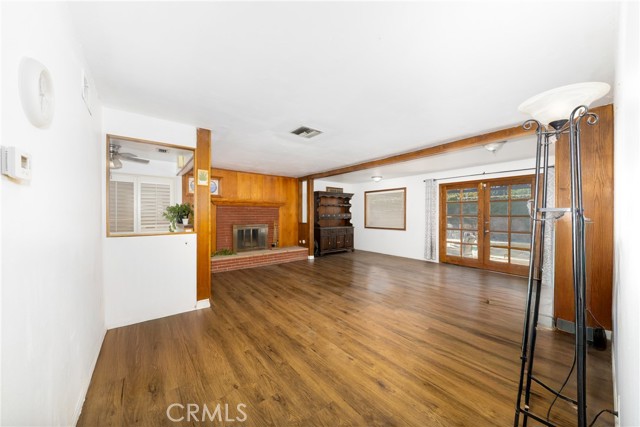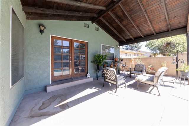French doors open to the backyard, complete with a solid covered patio,