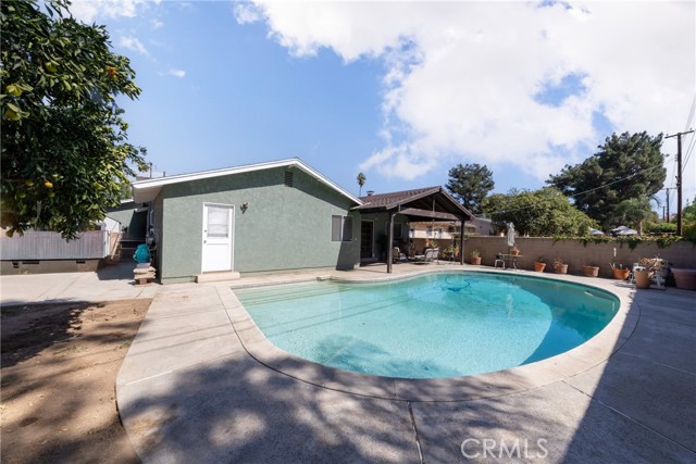 block wall fencing on all three sides, and a flourishing orange tree.