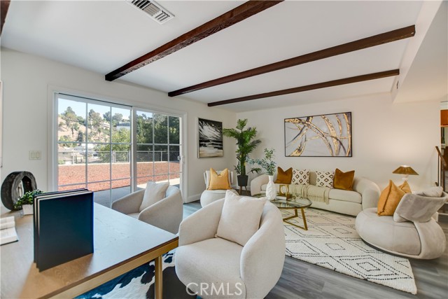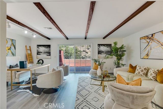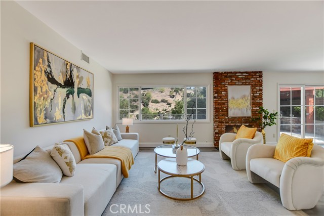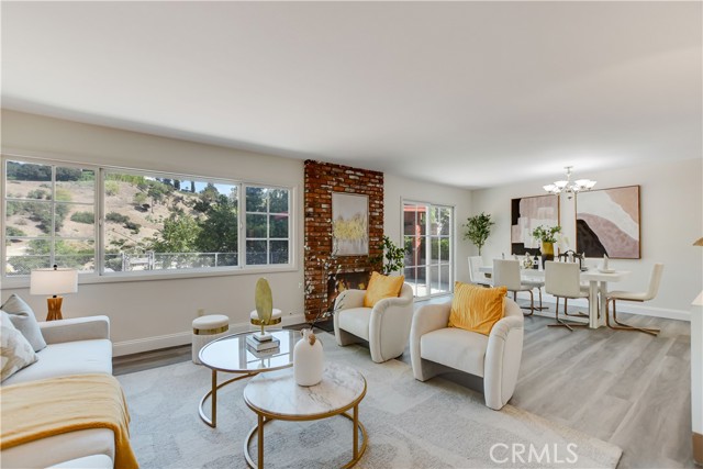 the backyard. The expansive living room is anchored by bright and sunny windows with hillside view and