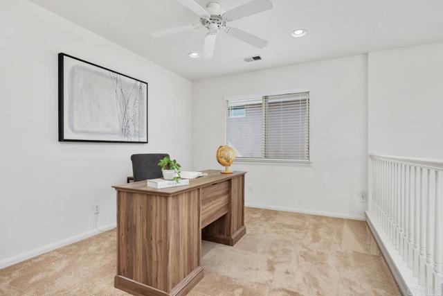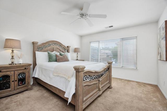 Discover the charming, gated community of Heritage-Legends, nestled within the beautifully master planned community of Shadowridge in Vista, CA. This residence boasts the largest floor plan available in the Heritage development, offering just over 1,700 square feet of spacious and comfortable living. Upon entering the home, you are greeted by an open floor plan of the formal living and dining rooms. These spaces feature a cozy fireplace and vaulted ceilings, creating an inviting atmosphere ideal for entertaining or relaxing with family and friends. Continue into the family room and kitchen area to find a newly renovated kitchen equipped with elegant cherry cabinets, quartz countertops, stainless steel appliances, and a walk-in pantry. Adjacent to the family room and dining nook, a charming patio offers the perfect setting for gardening, enjoying time with pets, or savoring your morning coffee. On the upper level, a spacious loft overlooks the downstairs living area. This versatile space is perfectly suited for use as an office, game room, or as an optional fourth bedroom to fit your needs. The primary bedroom, located at the top of the landing and accessible through double doors, features an ensuite bath with double vanities and a walk-in closet for ample storage. Two additional bedrooms and a conveniently located bathroom complete the upstairs layout. The property includes a two-car garage and a driveway, providing secure and convenient parking options for residents and guests. Shadowridge, Vista is a vibrant community of North County San Diego - situated adjacent to Carlsbad and Oceanside - just a few miles inland from the scenic California coast. It’s home to the Shadowridge Golf Club, Buena Vista Baseball Fields, and Buena Vista Community Park which features a tranquil duck pond and three miles of picturesque walking trails. Experience all the wonderful amenities and natural beauty that the Shadowridge community has to offer.