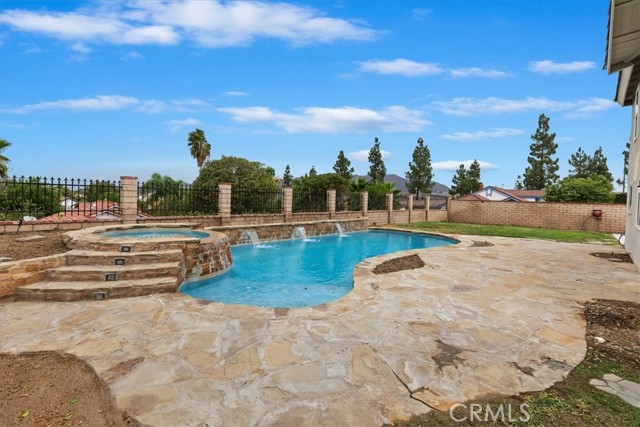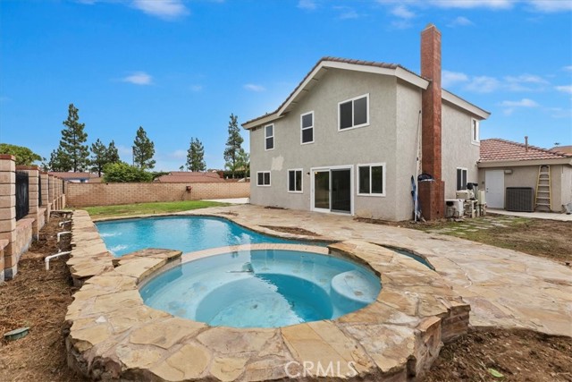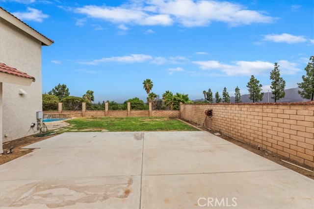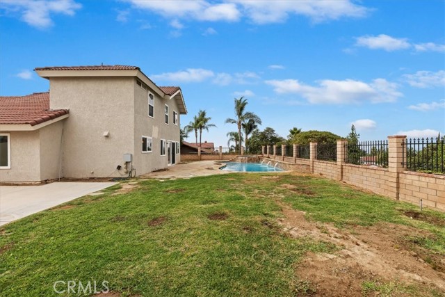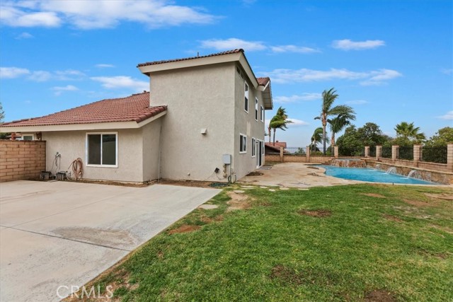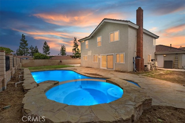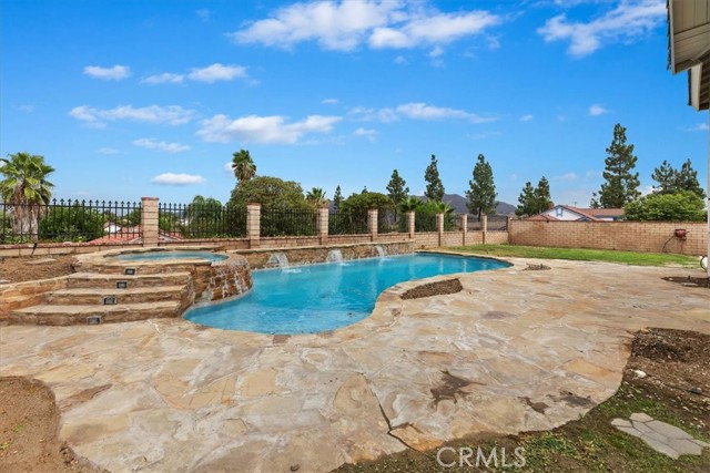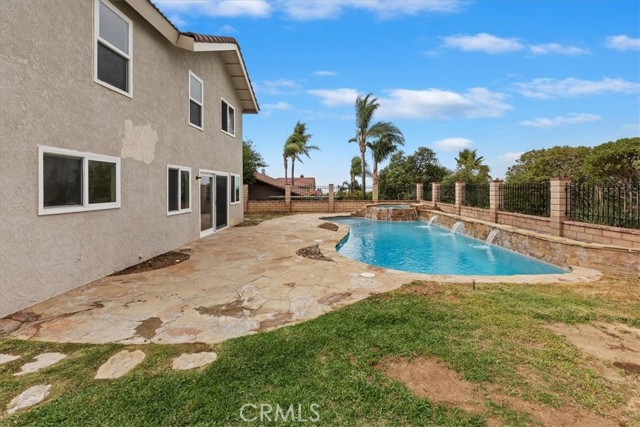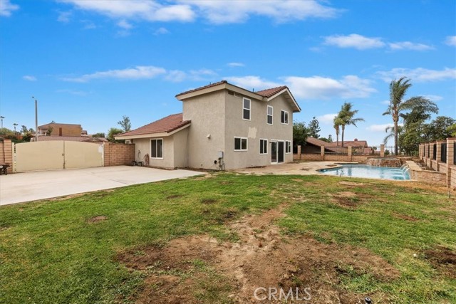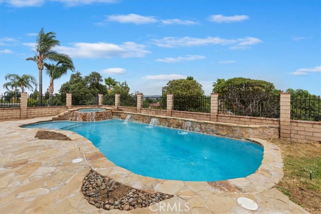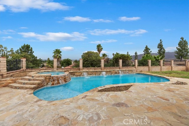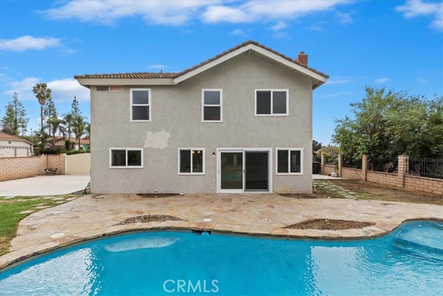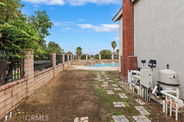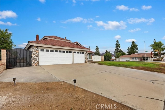 The backyard with a sparkling pool and spa and ample RV parking. A 3-car attached garage provides plenty of storage and workspace.