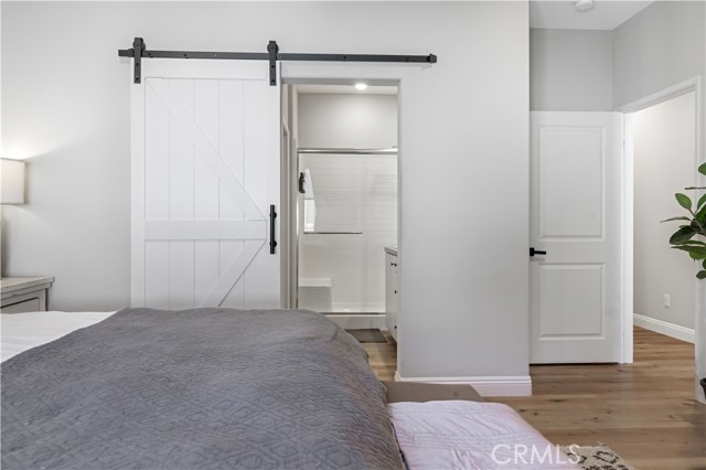 The spacious primary suite includes a sliding barn door leading to the ensuite bath and a Hunter ceiling fan with remote. Smart features include app-controlled lighting in key rooms, a Ring doorbell, Wi-Fi extenders, and a MyQ smart-garage system with built-in camera. Additional highlights include epoxy-coated garage flooring, upgraded black hardware, keyless front entry, and abundant storage with dual kitchen pantries and attic access.