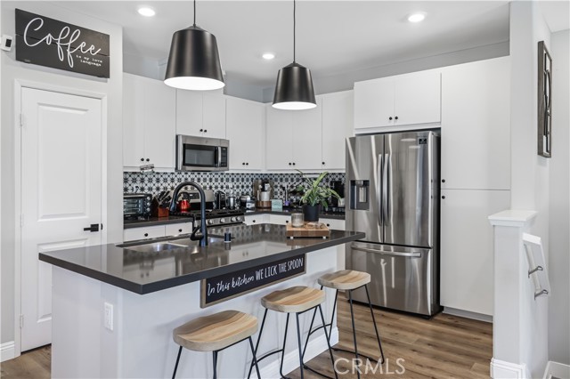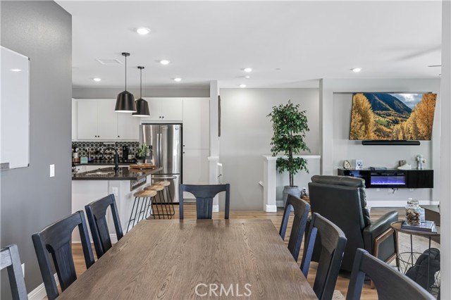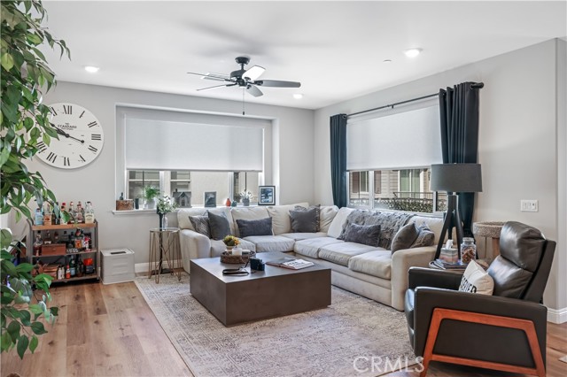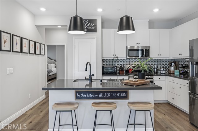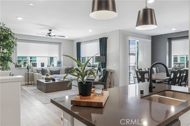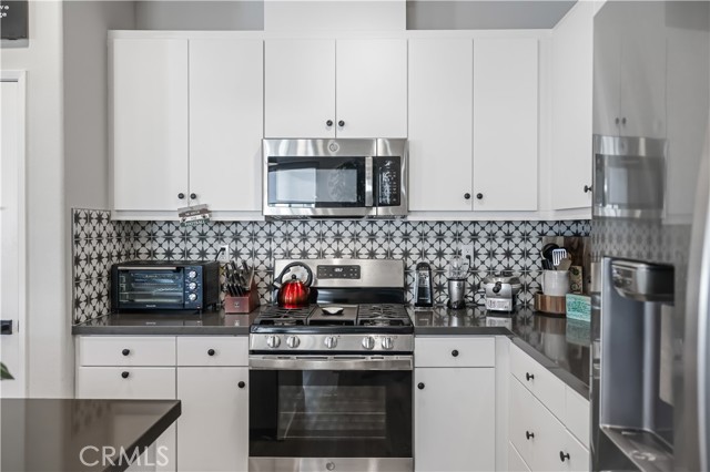 This beautifully upgraded 2-bed, 2-bath condo offers 1,311 sq ft of modern comfort and style. The open-concept kitchen features GE stainless-steel appliances, a Samsung refrigerator (included), tile backsplash with metal framing, pendant lighting, and elegant dark-gray quartz counters that continue into both bathrooms. Upgraded waterproof laminate flooring runs throughout, complemented by recessed lighting and custom blinds that allow in natural light while maintaining privacy.