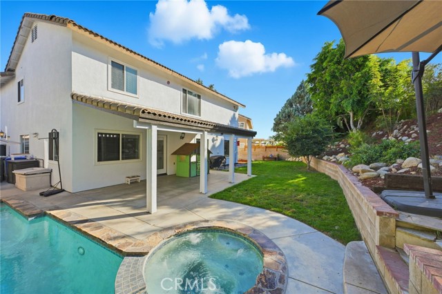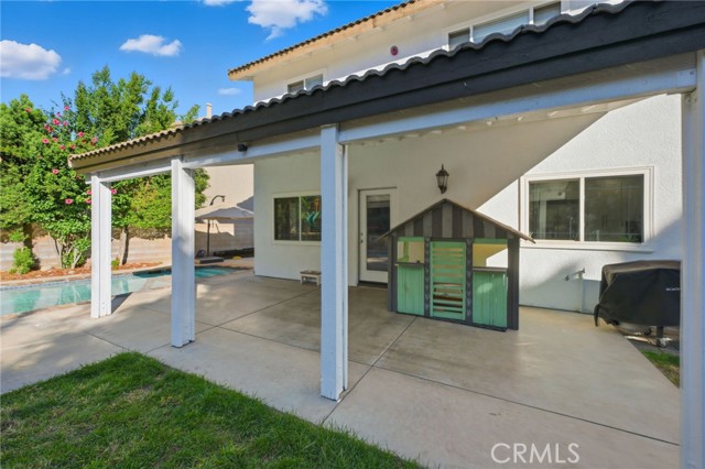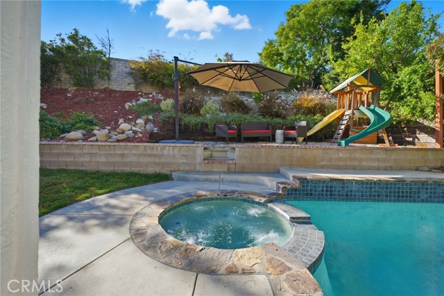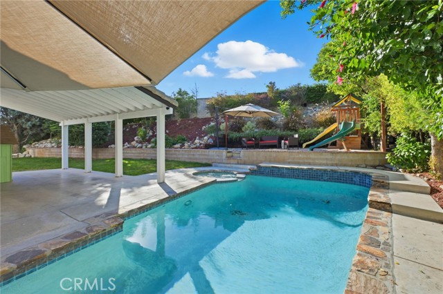 Step into your private backyard oasis featuring a custom swimming pool that’s ready for summer fun. The spacious outdoor patio includes a terrace area above the pool with potential for future expansion.