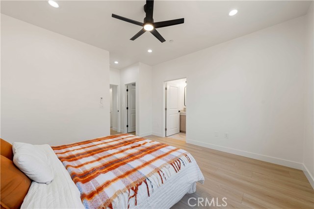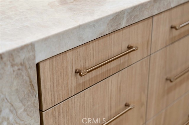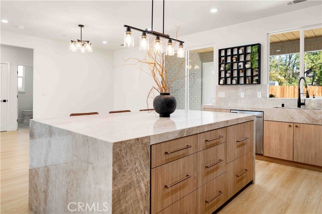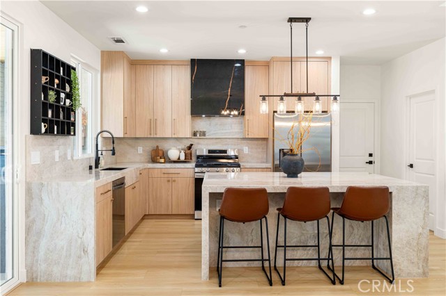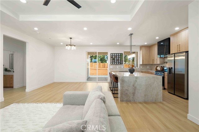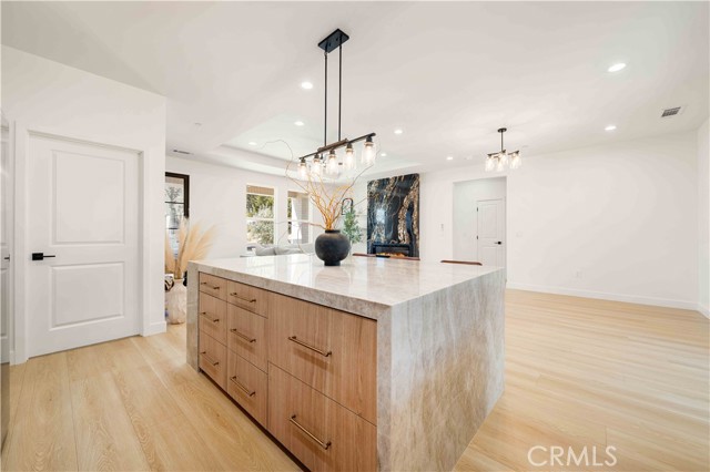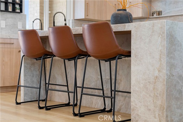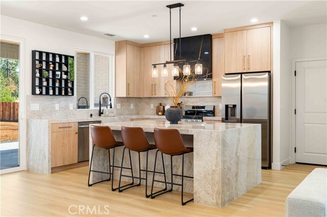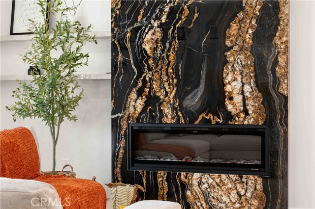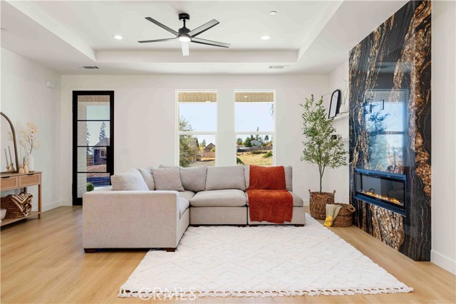 Inside, the open-concept layout showcases laminate flooring, ceiling fans in every room, and imperfect smooth textured walls that add warmth and depth. The gourmet kitchen is a showpiece, featuring elegant Taj Mahal quartzite countertops, a large matching island, soft-close modern wood cabinetry, and Delta/Kohler fixtures, including provisions for direct microwave hookup. Bathrooms mirror the same luxurious finishes with granite slab shower walls, Taj Mahal vanities, soft-close cabinetry, and Delta faucets. Additional highlights include a laundry room with sink, custom built-in closets, and a stunning accent granite electric fireplace with blow heat.