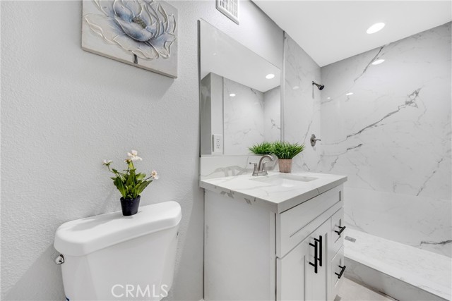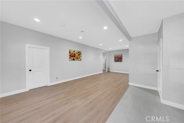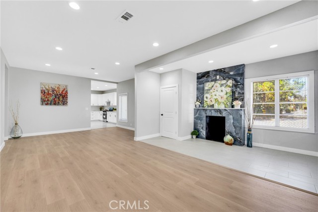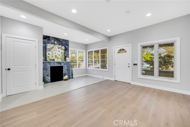 The living area is open and bright with plenty of recessed lighting. There are modern tiles and wood floors throughout.