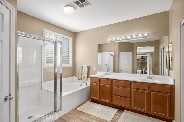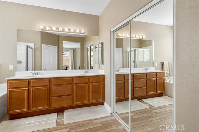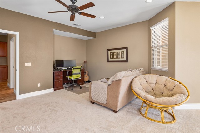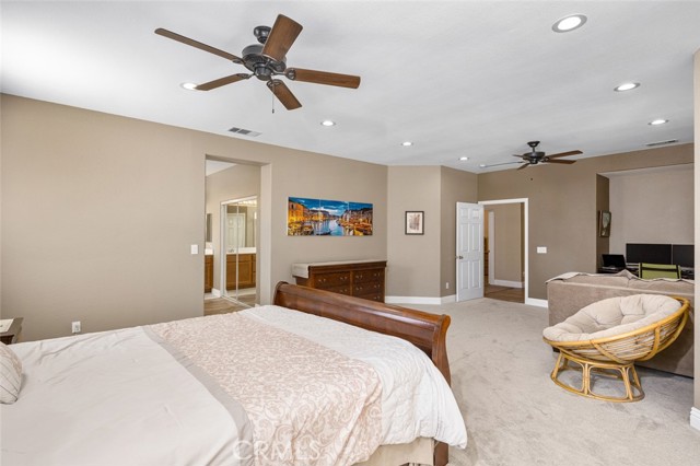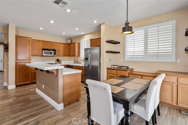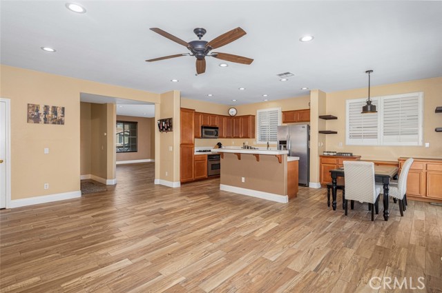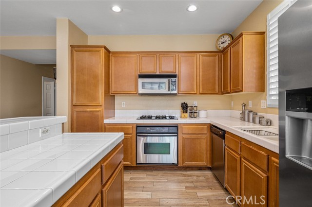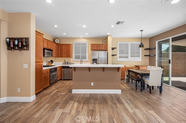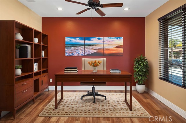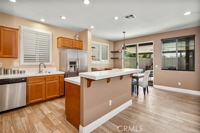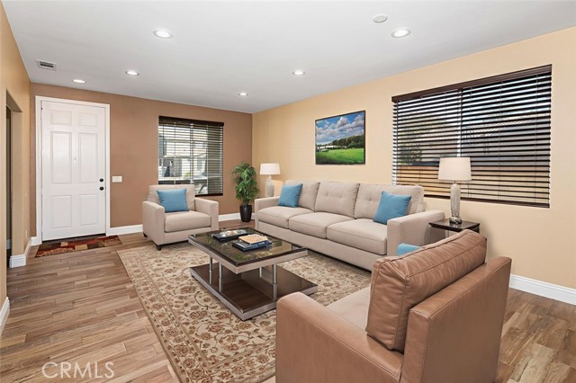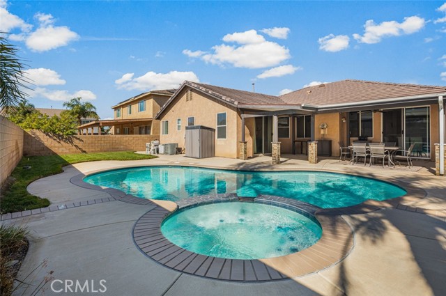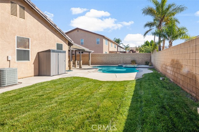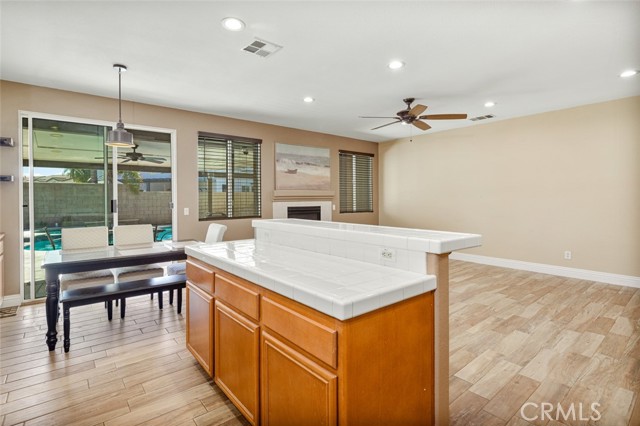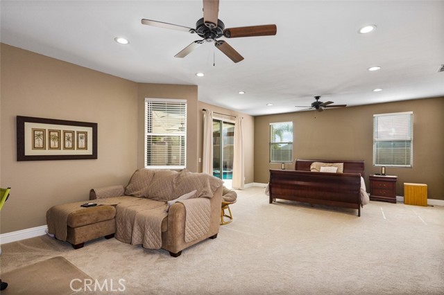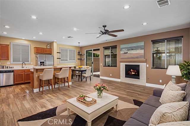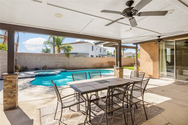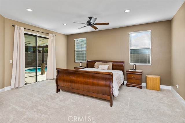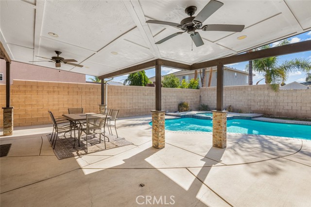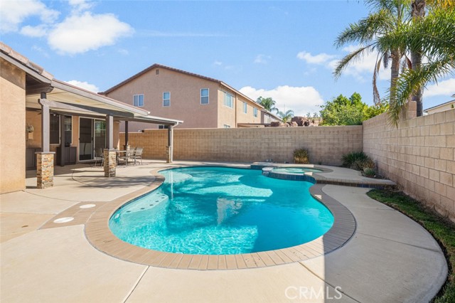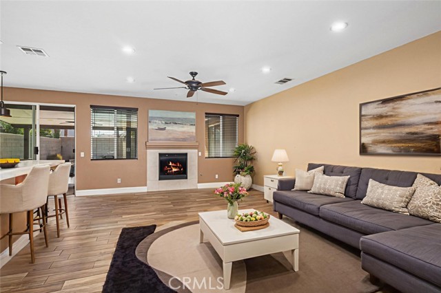 EXPANSIVE 2,299 SQ. FT. SINGLE STORY POOL HOME ON A OVERSIZED 7,405 SQ. FT. LOT WITH A 3 CAR GARAGE! This home is located in a very desirable neighborhood that reflects pride of ownership with no HOA dues and reasonable taxes! Upon entry, you are greeted by tall ceilings, recessed lighting and porcelain tile/wood grain flooring that are consistent throughout all main living areas. Your 4th bedroom, currently being utilized as an office, is secluded from the other bedrooms to maximize privacy. The open concept kitchen flows seamlessly to the massive family room with a gas fireplace and stunning rear yard through sliding glass doors. Your kitchen features wood cabinetry, stainless steel appliances, pantry and a center island with bar-top seating. A half bathroom off of the entertaining areas is perfect for accommodating guests. The primary bedroom suite is gigantic, showcasing an ensuite sitting area, sliding glass doors to the yard, a walk-in closet and primary bathroom with a soaking tub and separate glass enclosed shower. Two additional guest bedrooms near the primary are generously sized and share a second full bathroom. A full inside laundry room is located off of the hall. Your stunning and private rear yard has a large concrete patio with a well constructed patio cover to shelter you from the sun and keep the house cool. The inground pool and spa are perfectly situated for sunlight all day due to the east to west direction. A large grass area flanks the pool. Additional features include: A true 3 car garage, large driveway, tile roof and dual pane windows throughout.