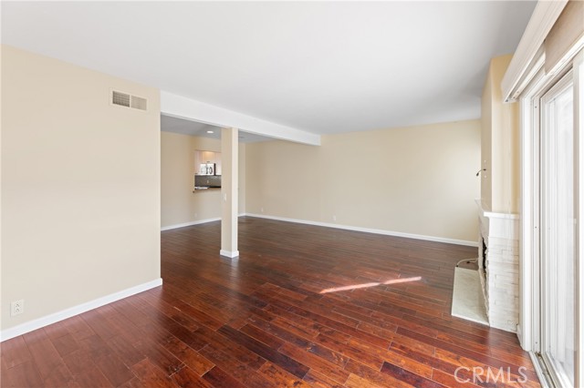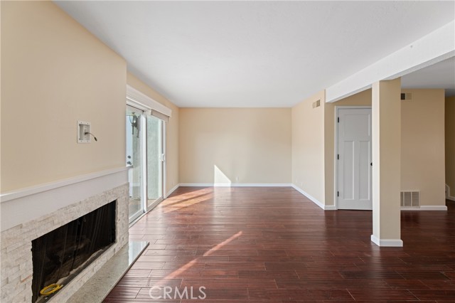 Bright and open, the Danbury is the largest floor plan in Somerset, Woodbridge. This 3-bedroom, 1.5-bath condo offers an inviting living space featuring a custom-designed kitchen with white shaker cabinets and newer stainless steel appliances. The living area highlights rich dark wood flooring and a charming white stacked-stone fireplace, creating a warm and stylish ambiance.