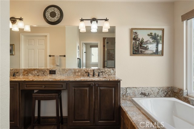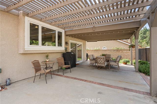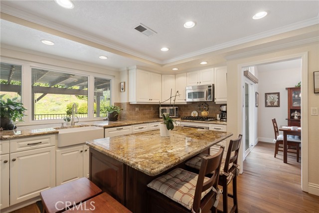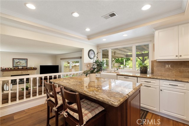 The upgraded kitchen offers stone countertops, built-in appliances, a pantry closet, and a center island with seating. Enjoy picturesque views of the backyard from the kitchen sink windows. The kitchen overlooks the warm and inviting family room, complete with a gas fireplace and another sliding glass door leading to the backyard.