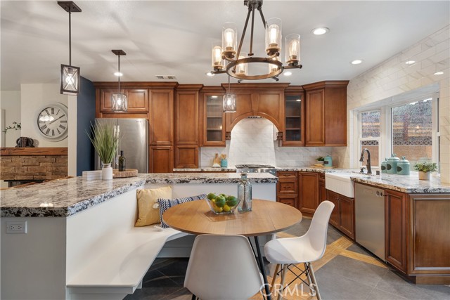 Step inside to a bright open concept living space designed for connection, and everyday living. Natural light fills the living room, where a wood burning fireplace creates the perfect setting for cozy evenings at home. The kitchen serves as the heart of the home, featuring rich wood cabinetry, a arched range hood, a spacious island for gathering, and a charming breakfast nook that is ideal for morning coffee, or casual meals.