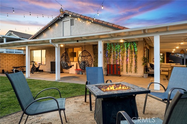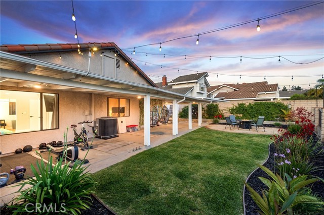 The backyard features a patio, lawn, and string lighting, creating a welcoming space for outdoor dining or relaxing evenings.
