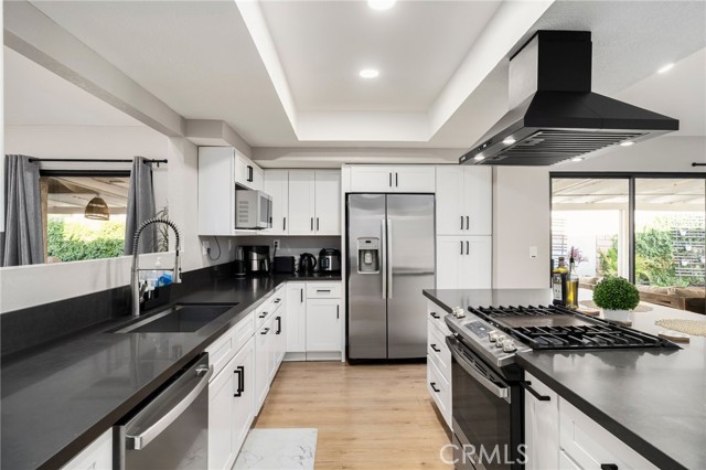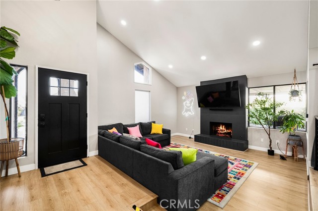 Inside, bright open living spaces feature high ceilings, a modern fireplace, and sliding doors that open to the backyard. The remodeled kitchen includes a large island and connects to a second living area that works well for gatherings or everyday living.