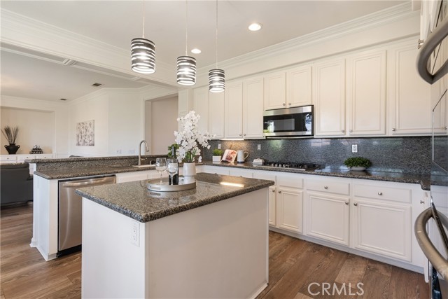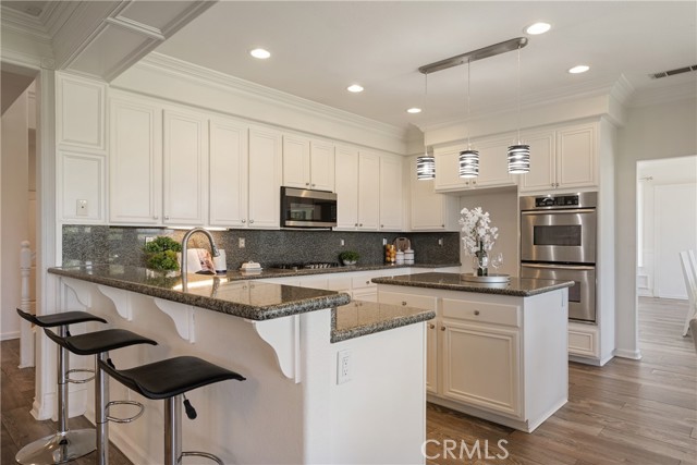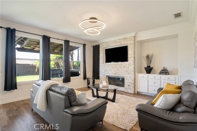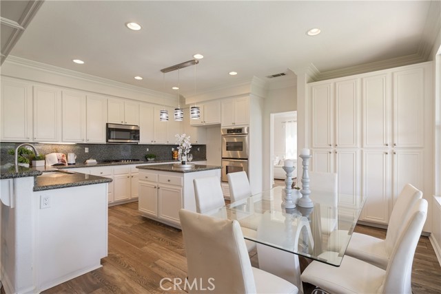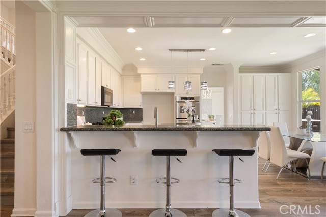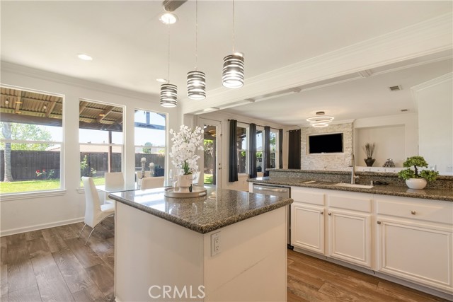 At the center of the home, the kitchen is designed for both function and gathering, offering granite countertops, white cabinetry, stainless steel appliances, a dining area, and bar seating. It opens seamlessly to the family room with a fireplace and built-in shelving, creating a warm and connected living space.