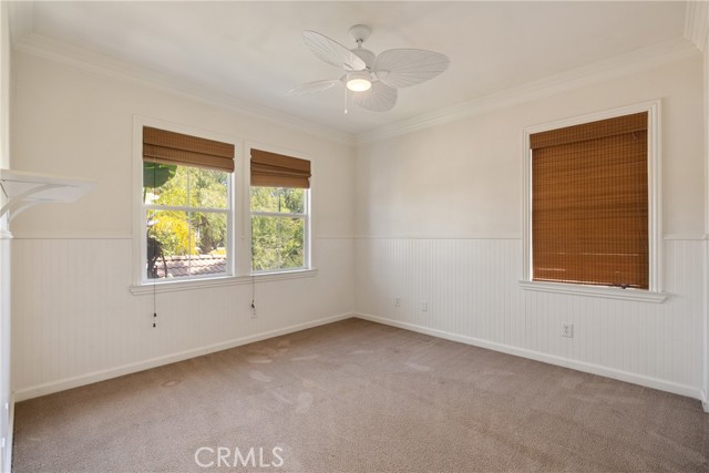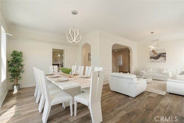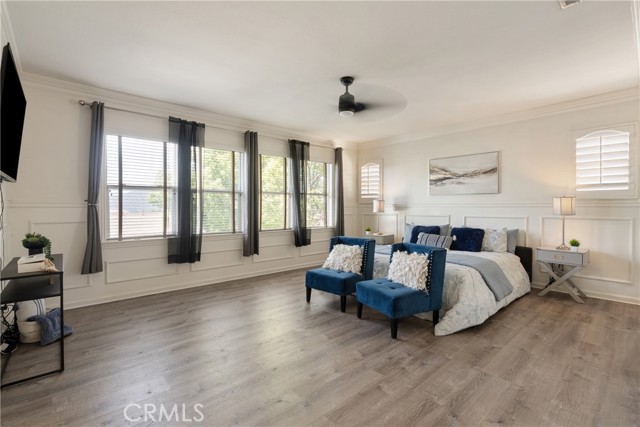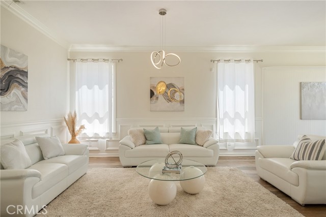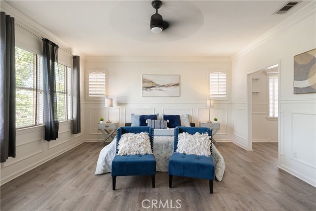 Additional features include plantation shutters, crown molding, wainscoting, updated lighting, window treatments, and a split two- and one-car garage setup.